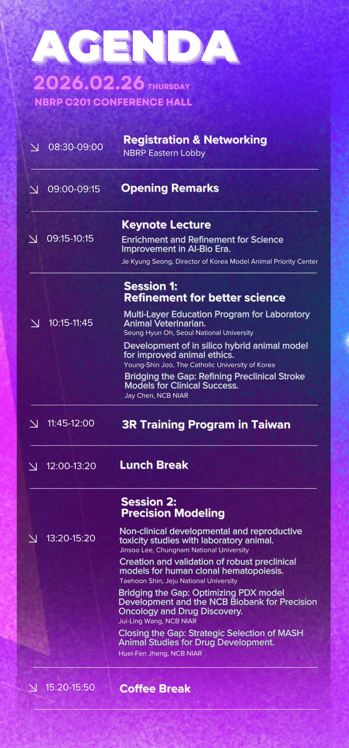 隨著國際社會對實驗動物福祉之重視持續提升,臨床前研究亦面臨重新檢視傳統動物模式之必要性。如何突破既有模式限制,透過優化、創新及新興科技導入,已成為重要研究方向。 本場研討會聚焦於實驗動物模式之精進策略,探討AI於臨床前疾病模式中的應用與發展趨勢,並透過跨領域專家之學術交流與研究成果分享,促進新世代疾病模型的建構,回應當前國際科研發展與動物福祉。